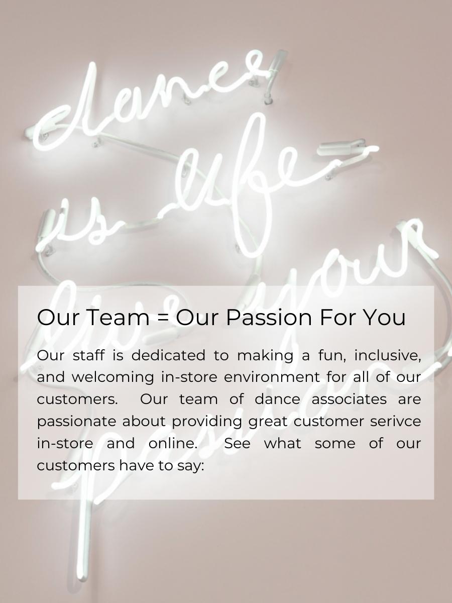 Dancewear Centre is a dance lifestyle store. We are all about that passion for dance and the products that compliment your dance lifestyle. Whether you’re just starting out or you’ve danced your entire life, you are part of our dance community, full of passionate people who share the same desire... to dance! We’re here to help you fulfill those dreams of dancing by providing you with the best possible products so you can go out there and dance your heart out!